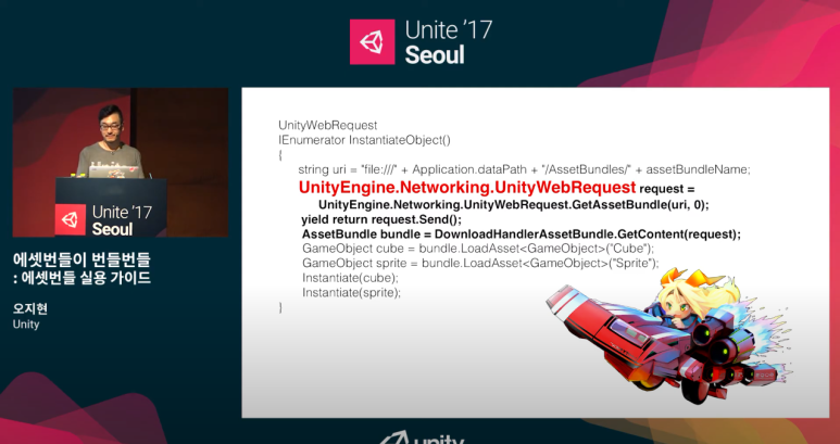 Resources 폴더 -> 에셋 번들 교체(스토리지에서 에셋 번들을 로드하고 사용하고자 하는 오브젝트를 꺼냄) -> 런칭 시점이 다가올 때쯤에는 로컬 디스크에서 에셋 번들을 가져오는 게 아니라 웹에서 다운로드하는 방식으로 변경!