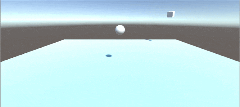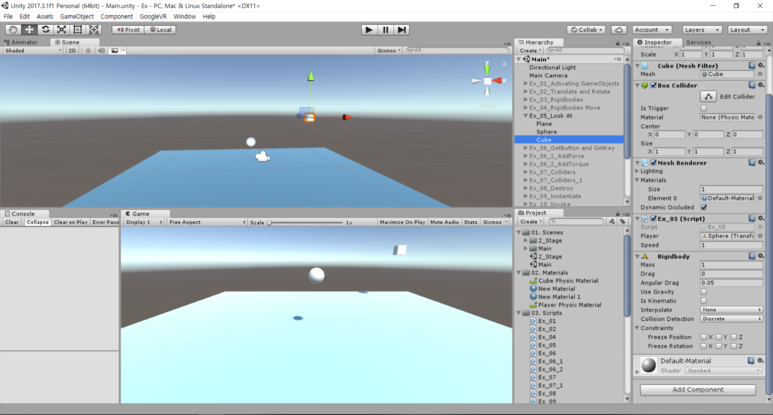 Sphere을 움직이면 Cube는 Sphere을 바라보며 따라오게 됩니다. 여기서 Cube의 Rigidbody 속성에서 Use Gravity를 체크하느냐 안 하느냐에 따라 조금 더 다양한 예제들을 만들어볼 수 있을 겁니다.