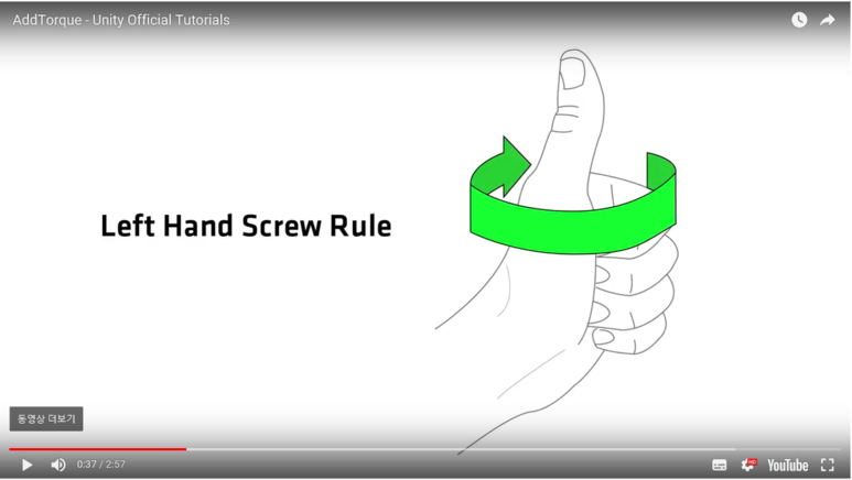Unity는 왼손 나사 법칙을 사용하므로 토크는 위 그림과 같이 축에 추가됩니다.