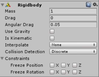 여기서 리지드바디의 Angular Drag 컴포넌트를 생각해볼 수가 있는데요. Angular Drag는 토크를 오브젝트에 적용하였을 때 영향을 주는 방식을 정의합니다. Drag를 공기 저항과 같이 생각하는 것처럼 토크에 의해 회전하는 오브젝트에 저항하는 힘이 생겨 점점 멈추게 하는 것이죠! 그렇기 때문에 Angular Drag의 값을 올릴수록 회전이 힘들어지며 0으로 하면 방해하는 힘이 없기 때문에 오브젝트를 계속 돌게 할 수 있습니다.