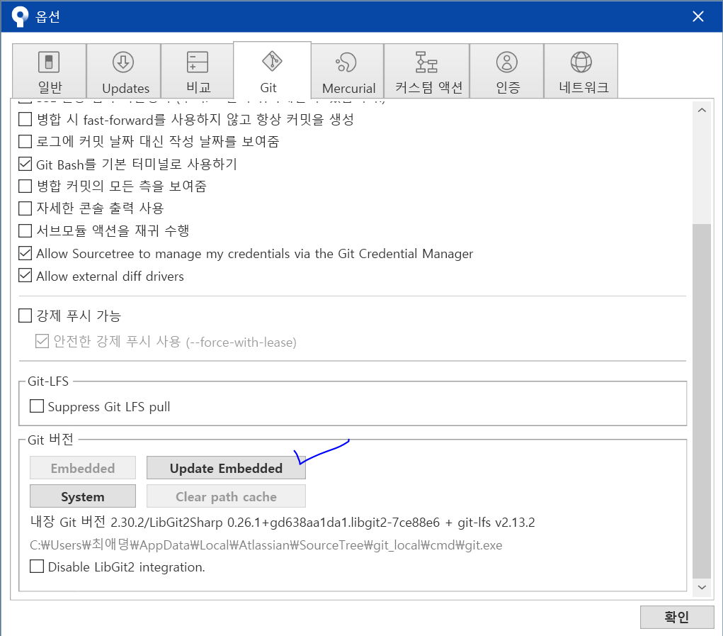 Sourcetree - 도구 - 옵션에서 Git부분에 가장 아래로 가서 Update Embedded 후 Sourcetree 재시작 후 해봐도 되는 경우가 생김