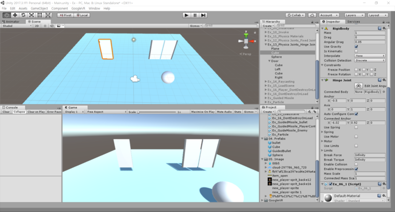 Hinge Jont도 다른 Joint와 마찬가지로 Rigidbody는 필수입니다. 나머지 속성들은 앞서 보았던 Joint 들과 비슷하기에 넘어가고 어떤 움직임이 나올지 실행 화면을 바로 보도록 하겠습니다.
