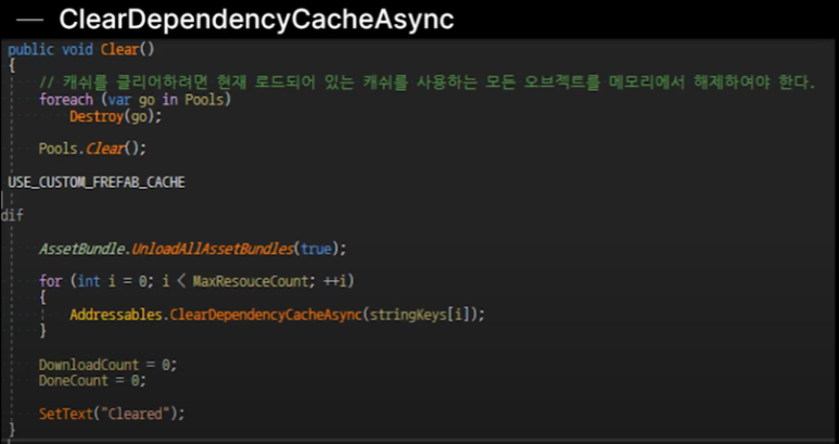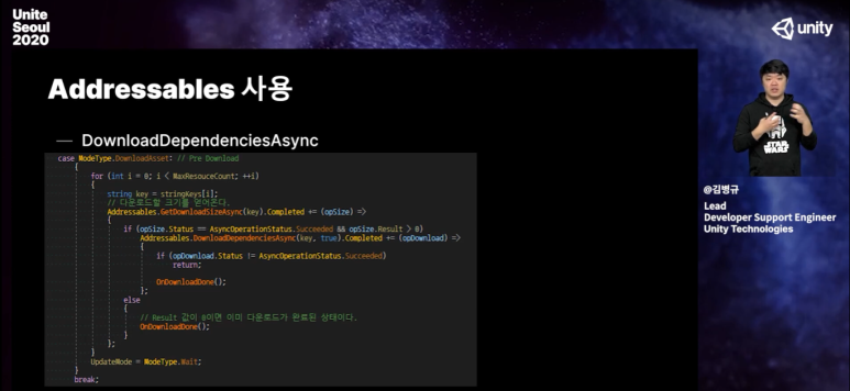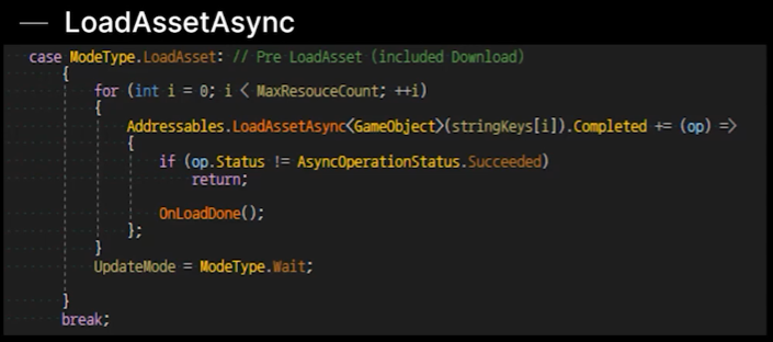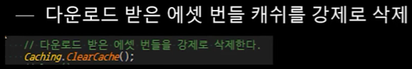 - 위에 함수에 관해 알아볼 때 DownloadDependenciesAsync를 이미 봤지만 DownloadDependenciesAsync의 경우는 번들을 모두 다운로드하는 것이고 LoadAsset을 통해서는 하나의 번들만 다운로드할 수 있다.