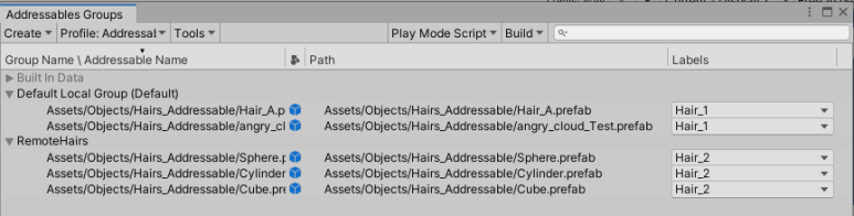 RemoteHairs 그룹의 경우는 제가 직접 만든 그룹이고 서버에서 받아올 에셋들만 분류해뒀다.