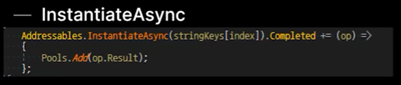 [Addressables.LoadAssetAsync<GameObject>("Address").Completed += obj => GameObject = obj.Result; //로 로드한 뒤 Instantiate(GameObject); 이렇게 생성도 가능]