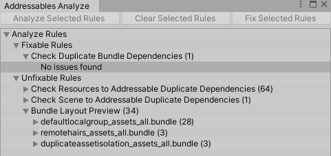 - Window - Asset Management - Addressables - Analyze를 통해 종속성 문제 등 여러 가지를 확인할 수 있고 Fix Selected Rules를 통해 어느 정도 수정도 가능하다.