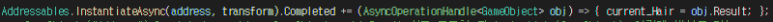 Addressables.InstantiateAsync(obj, transform.position, Quaternion.identity).Completed += (AsyncOperationHandle<GameObject> obj) => { list_obj.Add(obj.Result); };