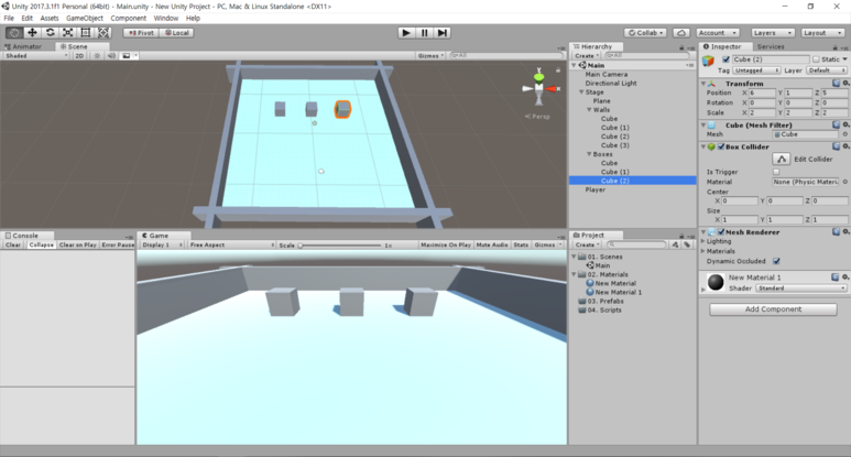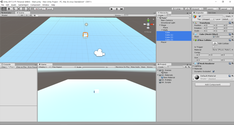 Cube의 Transform을 조정하여 위와 같이 벽을 만들어주도록 합시다!