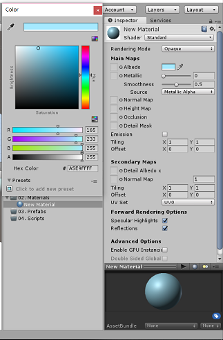 01. Scenes, 02. Materials, 03. Prefabs, 04. Scripts 폴더를 생성하고