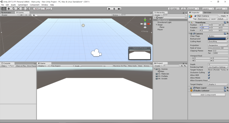 Main Camera의 Transform을 변경시켜 보기 좋게 해줍니다.
