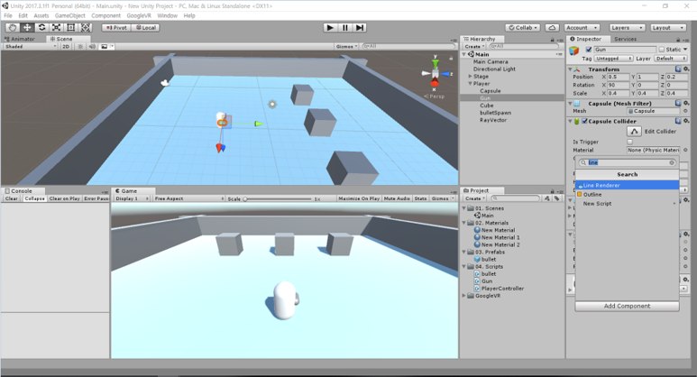 바로 Gun 오브젝트에 LineRenderer을 추가하도록 하겠습니다.