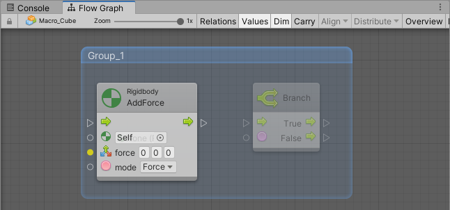 [위의 경우 AddForce에 마우스를 올려뒀기 때문에 밝게 보이는 것일 뿐 사용은 안 하고 있기 때문에 마우스를 내리게 되면 옆에 있는 Branch처럼 어둡게 된다.]