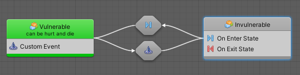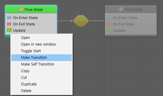 스테이트에서 다른 스테이트로 넘길 때는 위처럼 시작하고자 하는 스테이트에서 Make Transition을 클릭하여 다음 스테이트를 클릭해 주면 된다.