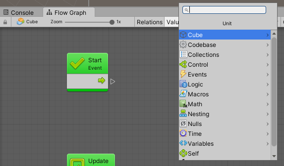 빈 공간에 오른쪽 마우스 클릭 시 기능 구현에 필요한 각종 Unit들을 불러올 수 있음