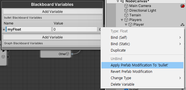 오른쪽 상단에 보이는 Blackboard Variables에 추가한 변수들 또한 드래그 앤 드롭을 통해 Get, Set으로 추가 가능