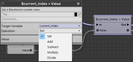 6. 변수를 Canvas에 Set으로 끌어 왔을 때 왼쪽 마우스로 클릭해보면 왼쪽 상단에 위와 같은 window가 뜨고 꼭 set이 아니라 다른 여러 계산을 할 수 있다.