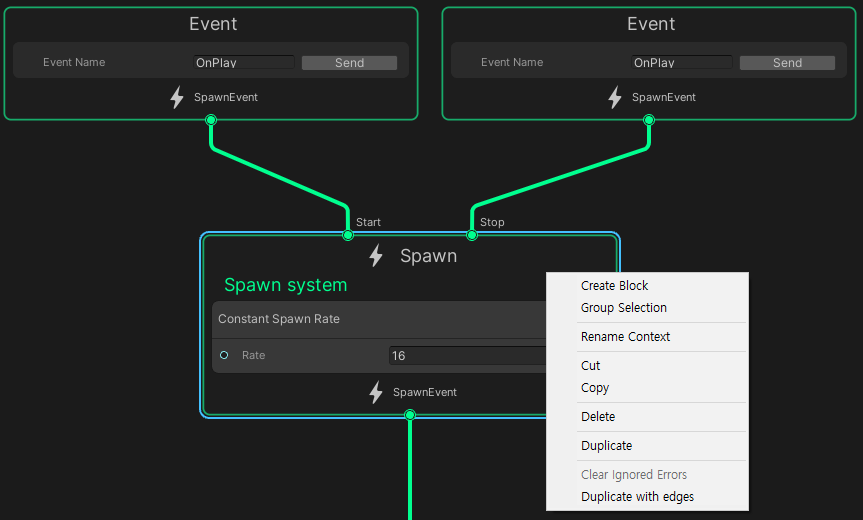 - Spawn system block에 있는 Rate에는 blackboard에서 생성한 값을 대입도 당연 가능 (생성 주기)
