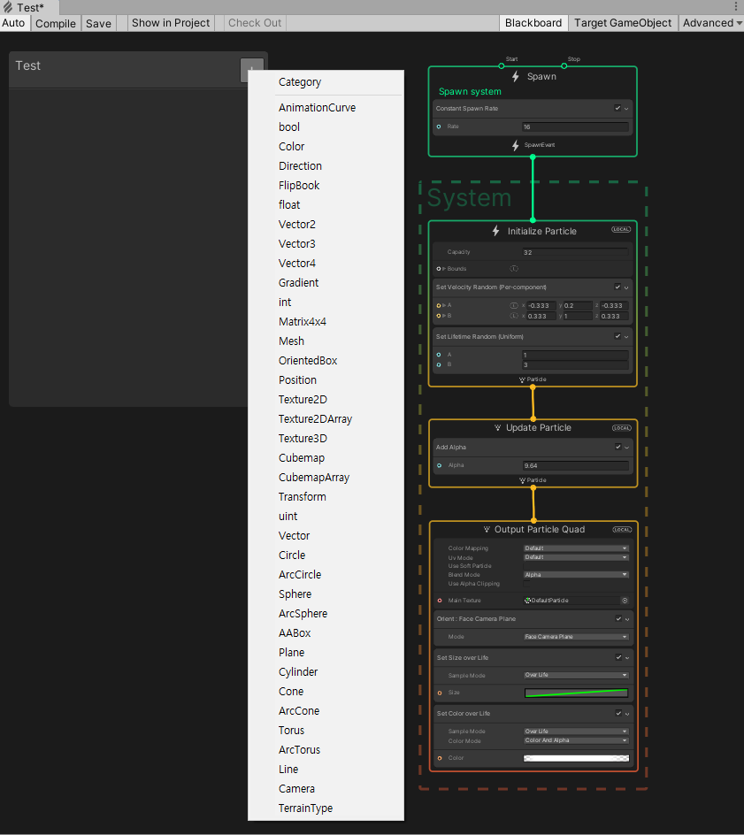 - Particle을 기존 시스템보다 매우 훨신 많이 사용 가능하고 노드를 통해 여러 값들을 좀 더 쉽게(코딩을 줄이고) 변경하며 VFX를 제작하도록 도와주는 툴 (노드 그래프 방식의 Particle effect 제작 툴)