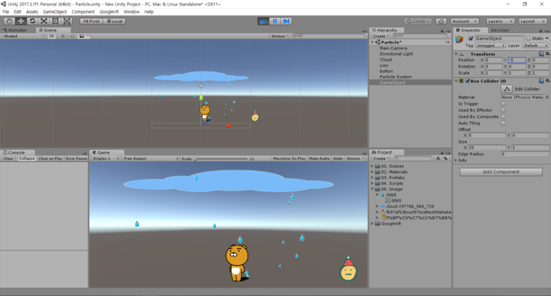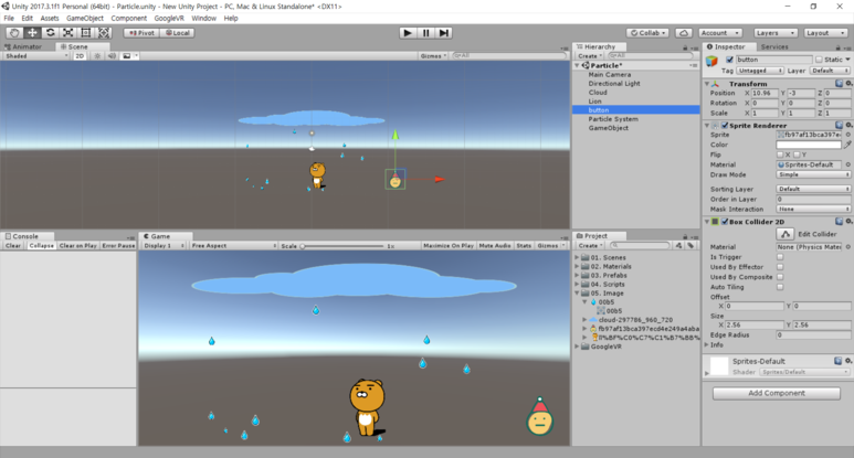 여기서 2D이기 때문에 Main Camera의 속성 중 Projection을 Orthographic으로 바꾸어 주시면 이미지가 휘어 보이는 일은 없을 것이고, 빗방울의 경우 포토샵이나 일러스트로 하얗게 그리셔서 사용하시면 후에 Particle에서 직접 색을 변경하셔서 사용하시면 더 이쁘게 표현하실 수 있습니다.