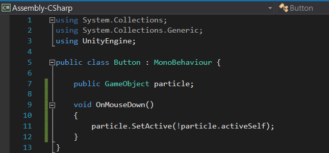 마우스로 버튼 이미지를 클릭할 때마다 Particle의 Actice 상태의 반대의 값을 넣어주어