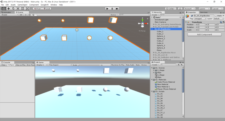 이번 예제는 간단하게 3D object인 Plane과 Cube, Sphere를 사용하였으며 스크립트는 없습니다.