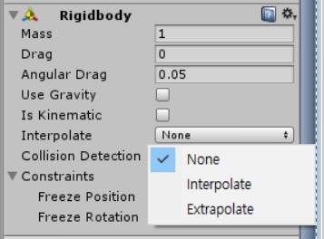 -> Rigidbody를 통해 오브젝트가 이동할 때 사소하지만 불필요한 움직임이 감지되면 Interpolate 설정을 사용하여 이전 프레임을 기반으로 변형 이동을 부드럽게 할 수 있습니다.