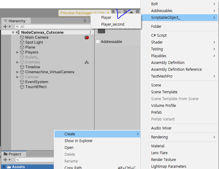 위처럼 asset을 생성하기 위해 [CreateAssetMenu(menuName = "ScriptableObject_/Player", order = 0)]